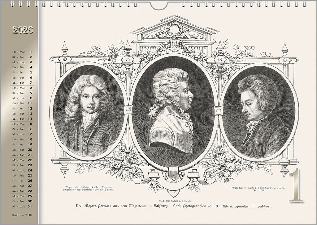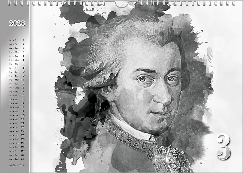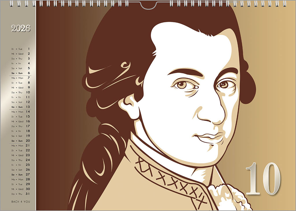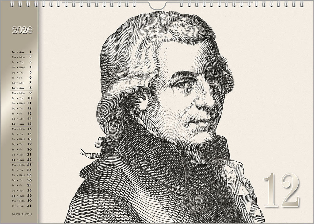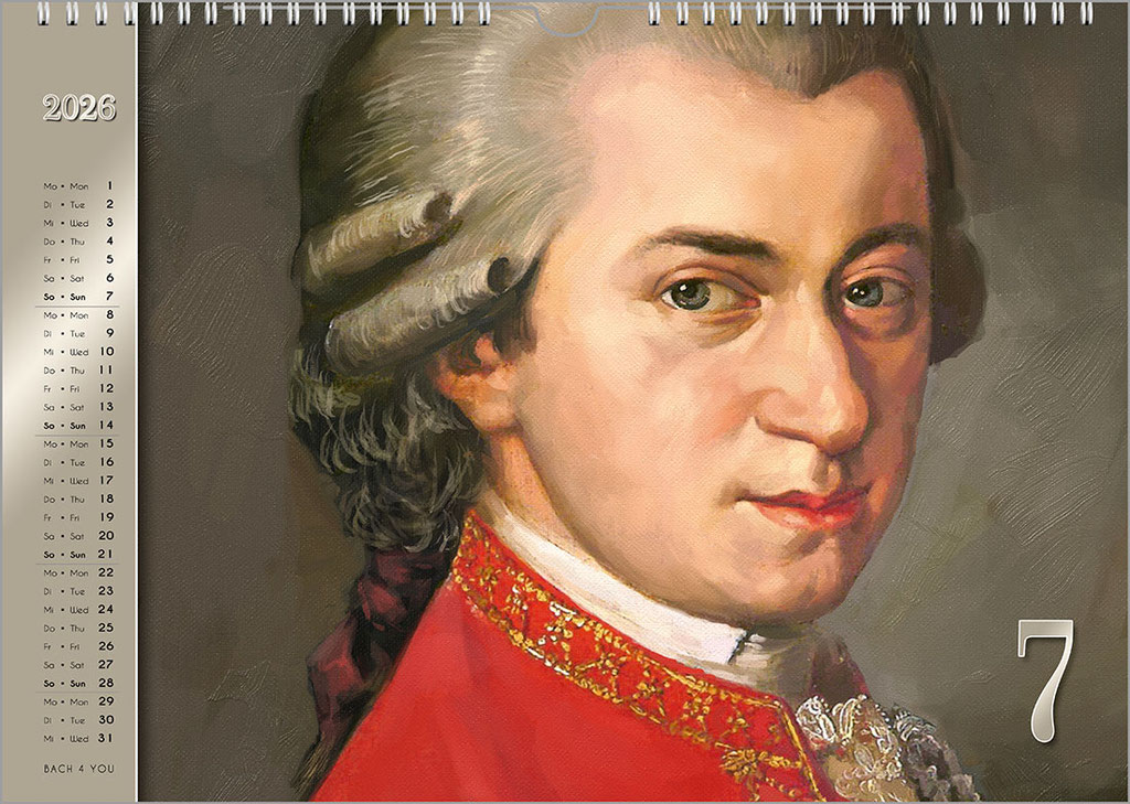 Der Mozart-Kalender „Wolfgang Amadeus Mozart“. Zusammen mit dem Beethoven-Kalender „Ludwig van Beethoven“ und dem „Luther-Kalender“ ist es unsere „Just One Composer Edition“.
