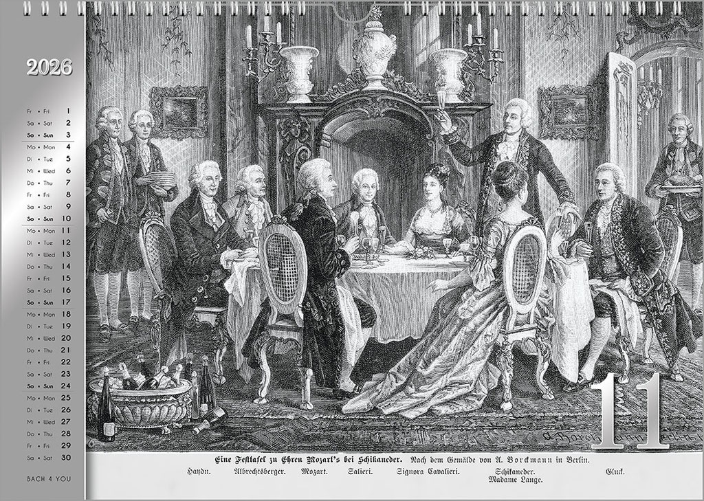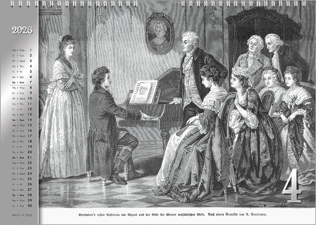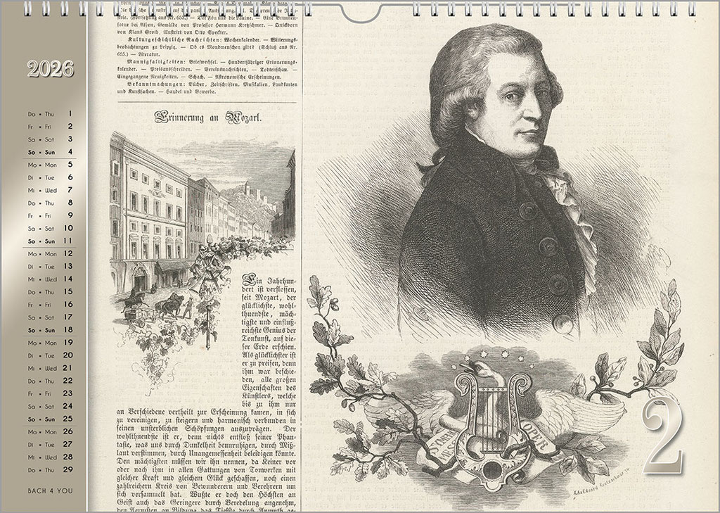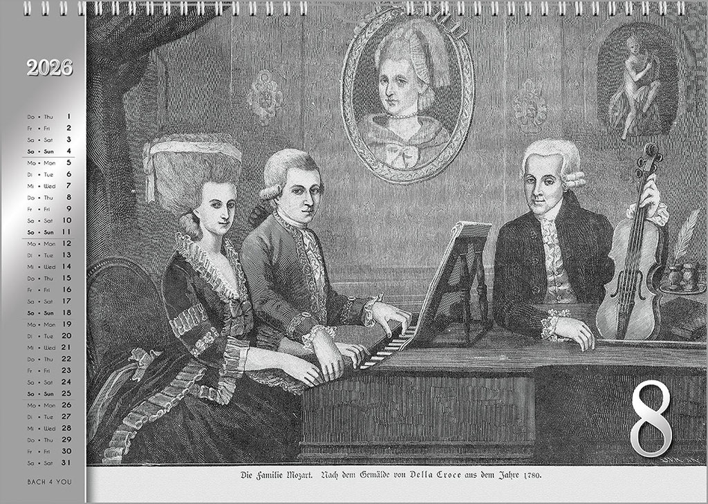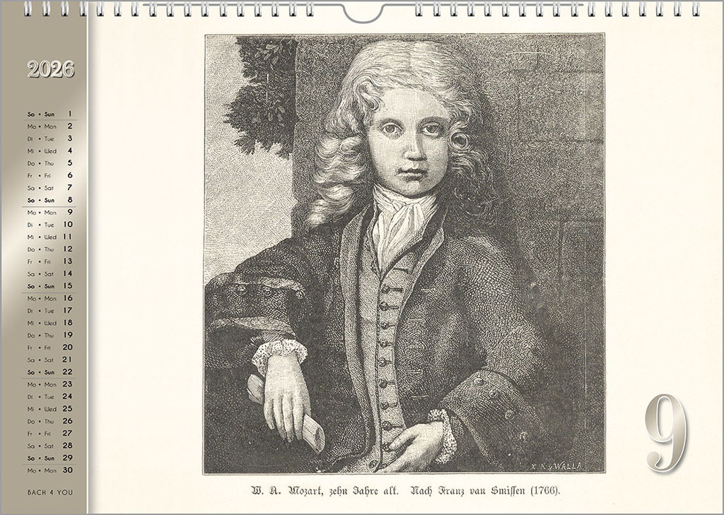 Der Mozart-Kalender „Wolfgang Amadeus Mozart“. Zusammen mit dem Beethoven-Kalender „Ludwig van Beethoven“ und dem „Luther-Kalender“ ist es unsere „Just One Composer Edition“.